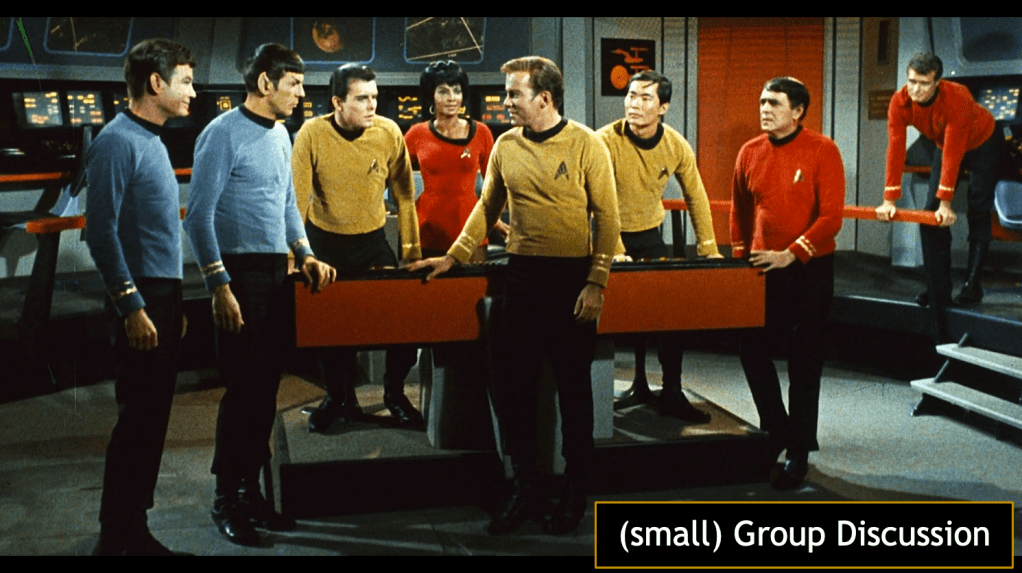 Then the people were asked to team up. There were prepared zoom breakout rooms in the call with names fitting the theme (“Bridge”, “Captain’s Ready Room”, …). On one slide there was a pre-selection which characters would meet in which room. In this way it was a random meet & mix of people who would share their thoughts.