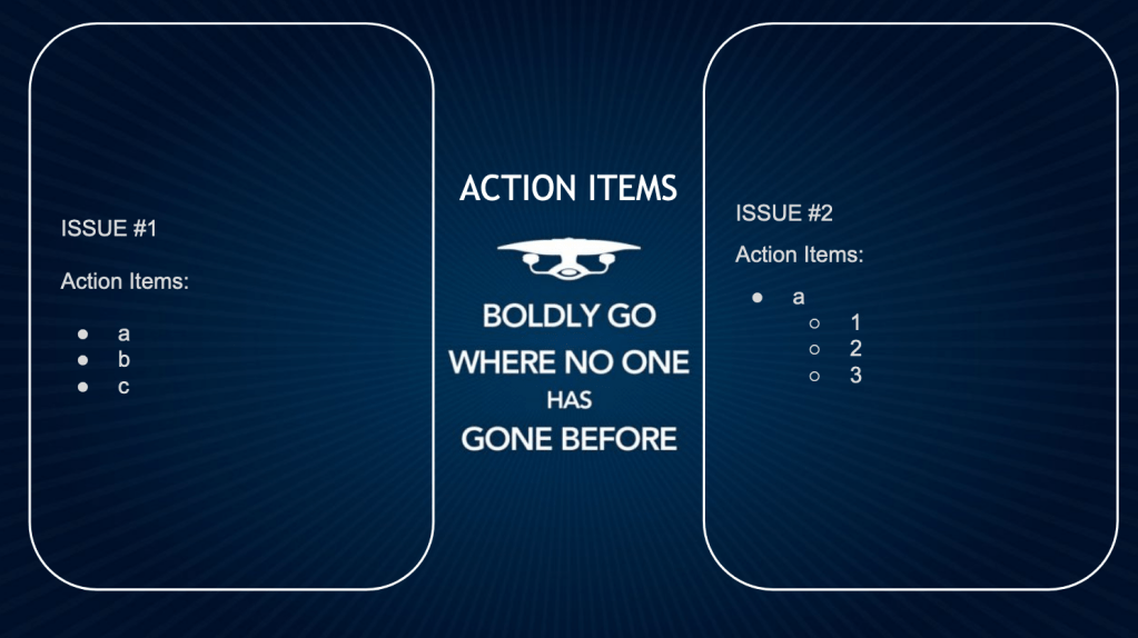 So I wrapped the retro into a Star Trek Story. I used the video conferencing system Zoom which allowed me to share video and audio from my computer. And it allowed me to design “breakout rooms” which I could then assign to the people. This was particularly helpful to have all the different discussions with different amounts of people. I also used google slides as the collaborative tool.